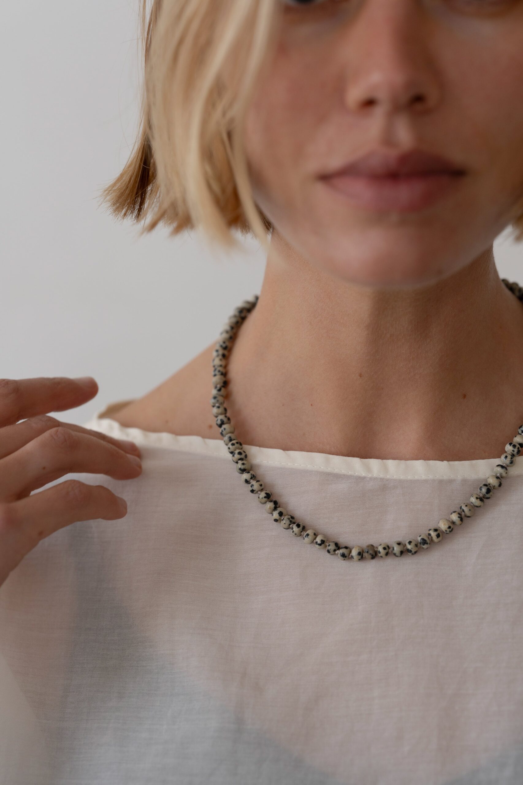 Hand-strung in Los Angeles, this necklace features Dalmatian Jasper rondelle beads, each knotted by hand for an elevated finish. It’s completed with 14k gold findings and measures 18″ in length.