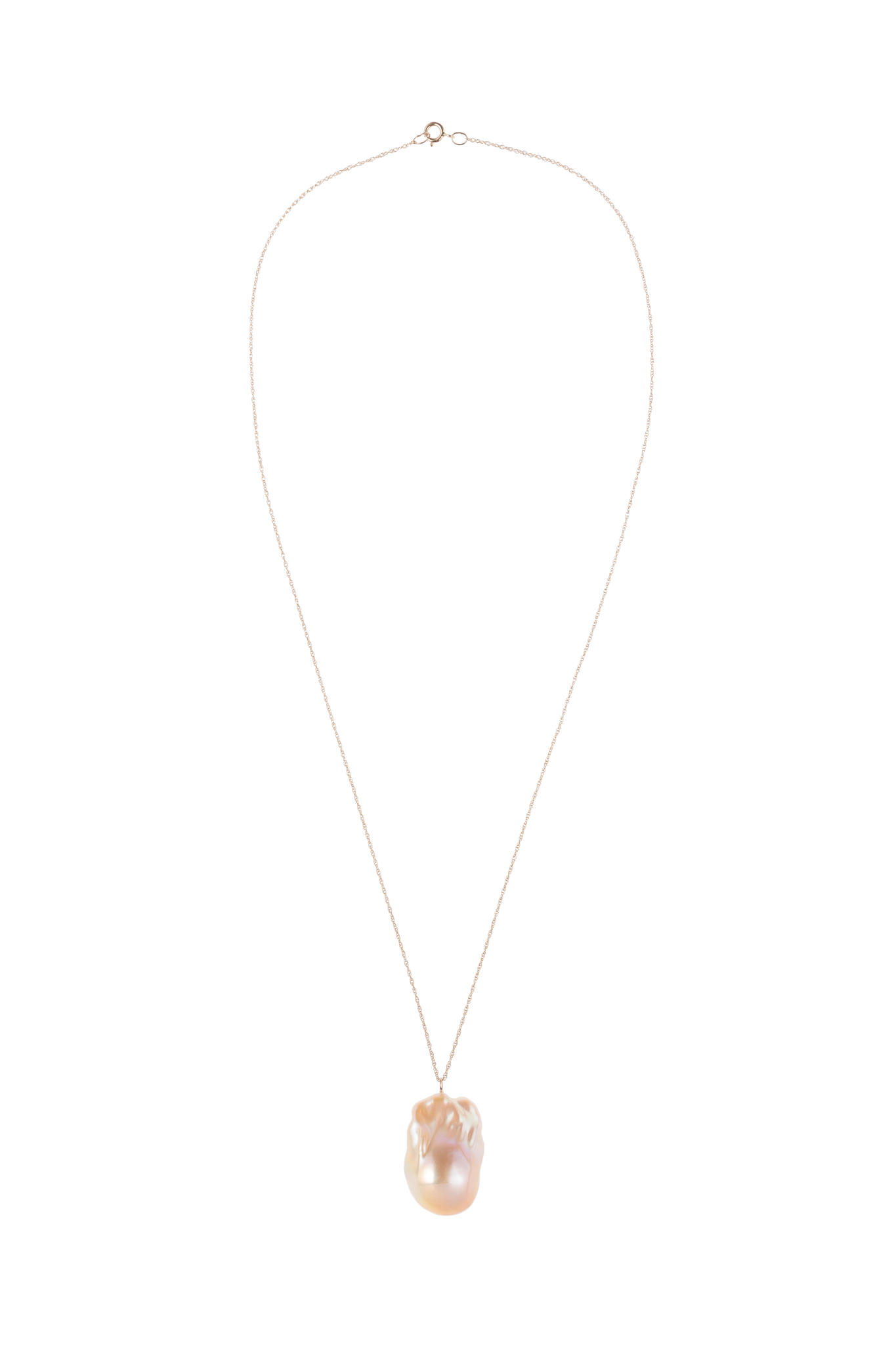 The June 16″ Pink Pearl Necklace is handcrafted locally in Los Angeles and features a single baroque pink pearl suspended from a 16″ 14k gold link chain with a spring ring clasp. Each pearl is naturally formed and celebrated for its one-of-a-kind shape and inherent imperfections, measuring approximately ½”. No two are alike, making every piece truly unique.