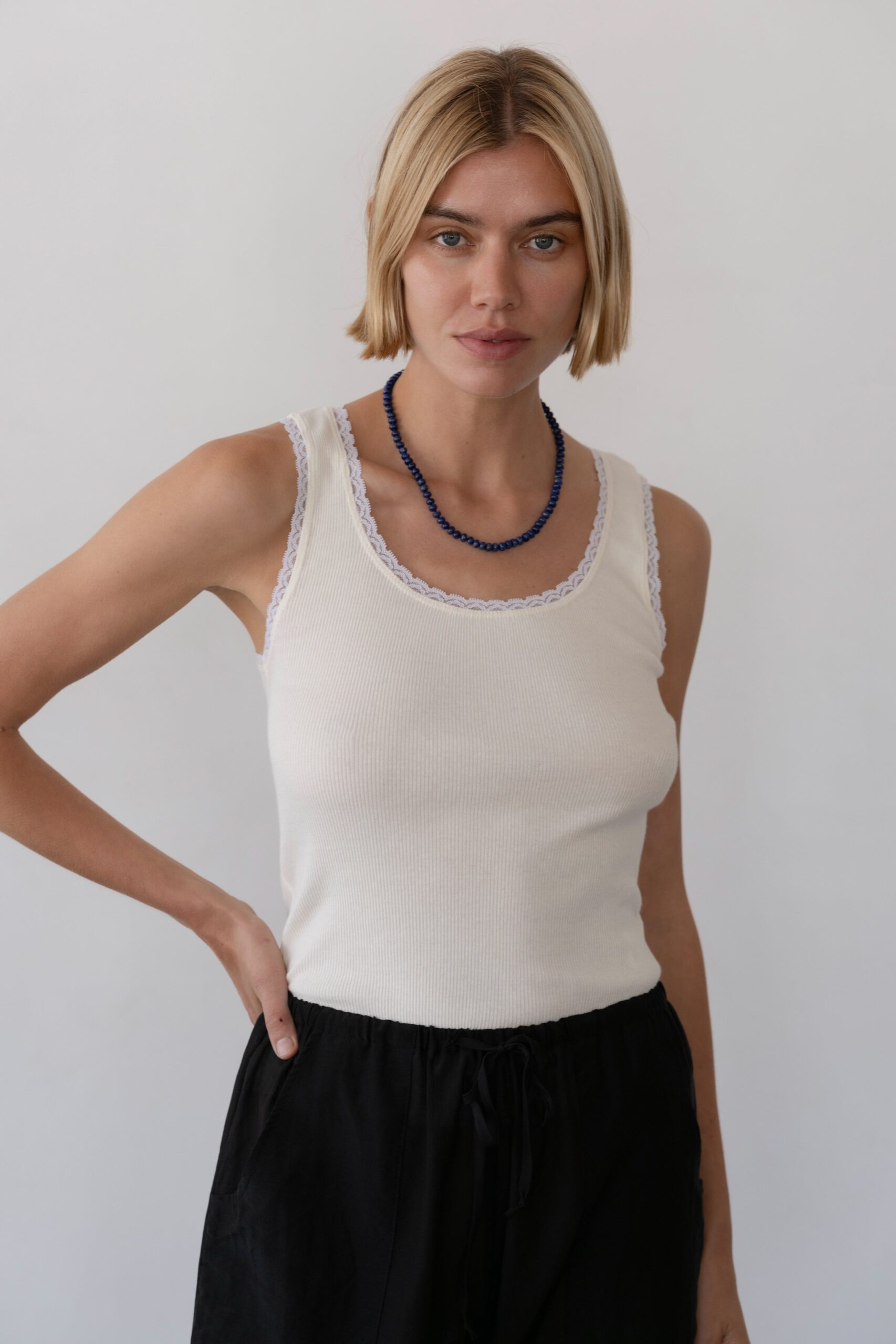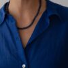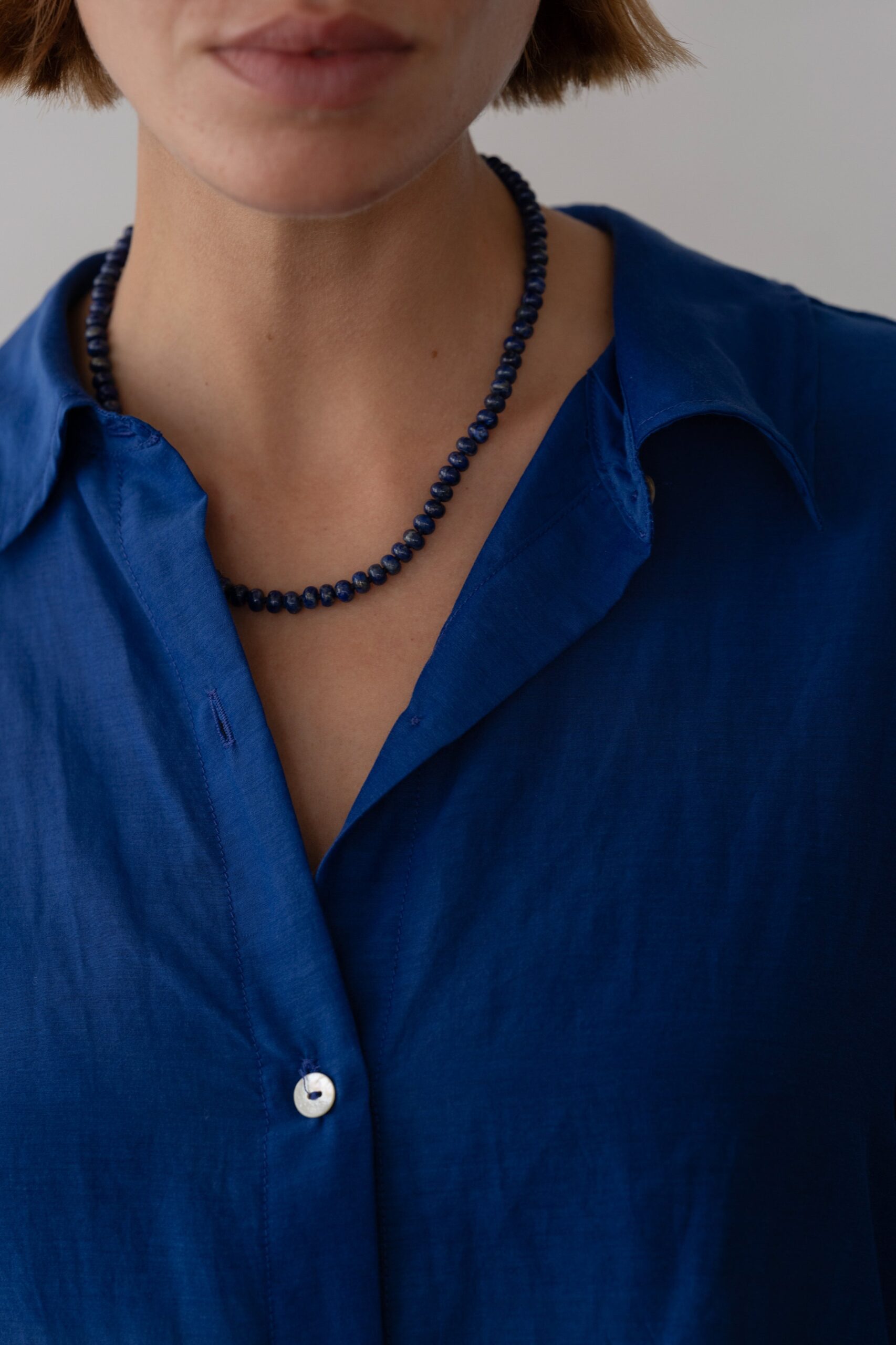 Hand-strung in Los Angeles, this necklace features Lapis rondelle beads, each knotted by hand for an elevated finish. It’s completed with 14k gold findings and measures 18″ in length.
